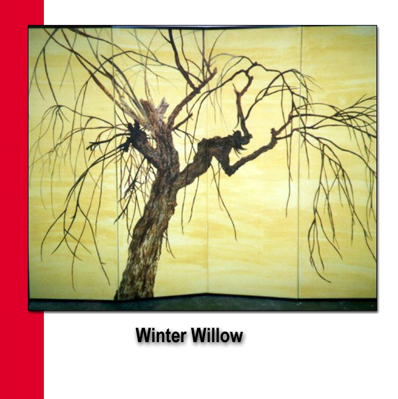 Design: Based on a hand-painted scroll from the 16th Century by Kaido, "Willow in the Winter", complimented by a Haiku song from the 15th Century by Kubashi. Medium of painting acryllics and watercolor.