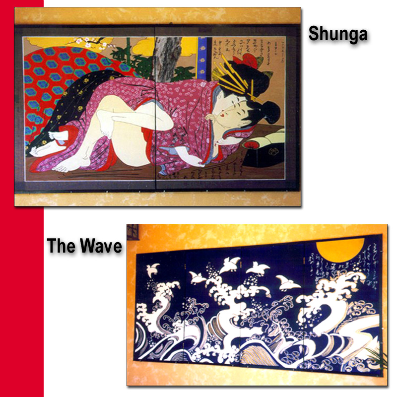 Design: Young samurai and his courteasan lover based on a print by Utamaru combined with erotic poetry by Akitada. Medium liquid gold acryllics and somi ink.